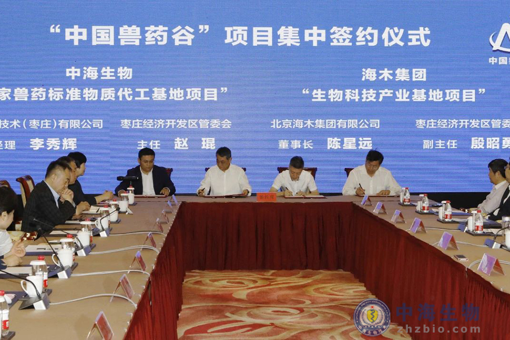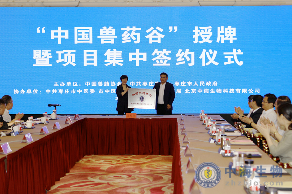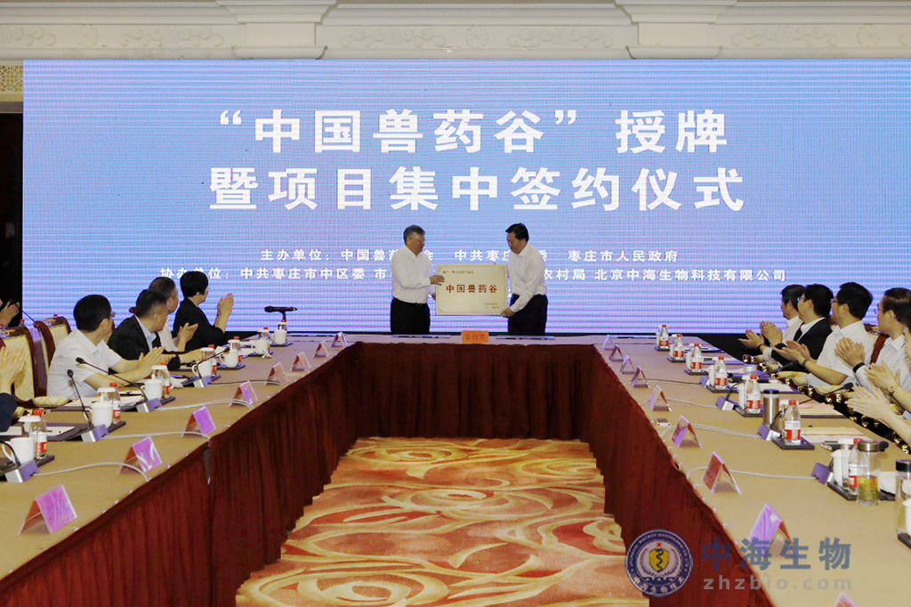 儀式上,才學鵬為棗莊經濟開發區“中國獸藥谷”授牌,中國獸藥協會為“中國獸藥協會病原微生物培養及工藝技術委員會”授牌;市政府與省畜牧獸醫局簽署“共建中國獸藥谷戰略合作協議”,棗莊經濟開發區管委會與中海生物技術棗莊有限公司等有關企業就“國家獸藥標準物質代工基地項目”“生物科技產業基地項目”“生物發酵大平臺項目”進行簽約;山東財匯控股集團與華盛綠色工業基金會簽署“新獸藥產業基金項目”協議。